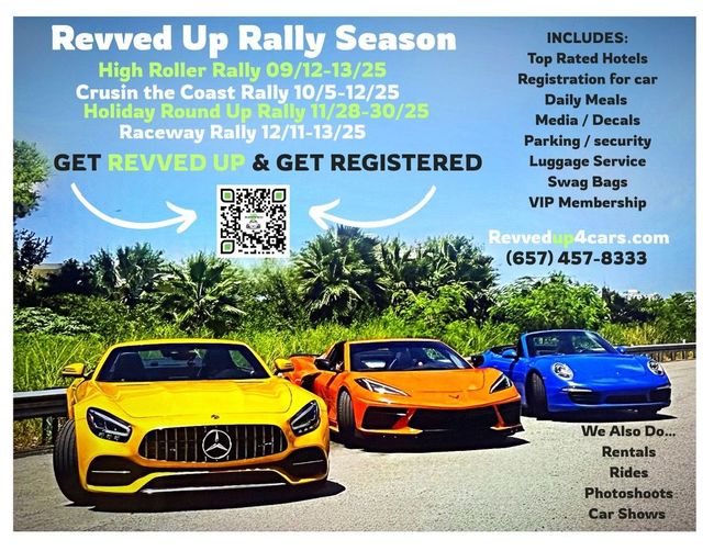 These are not your average car events. It's a car enthusiast's experience! All-inclusive options for our shows, rides, or rallies. We want you to feel like a VIP. We even have VIP memberships. We specialize in organizing events, cruises, and entertainment!! So, come roll with us and get ready to rev your engine at one of our events.